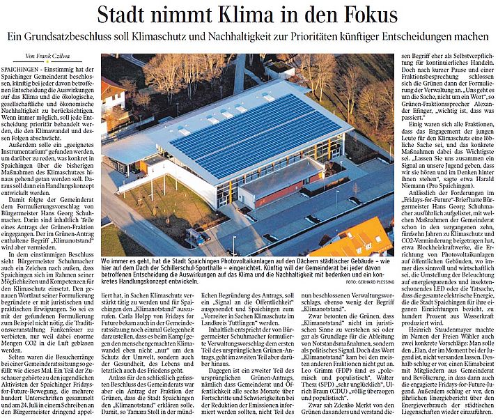 Zwar hat die Fraktion der Grünen im Spaichinger Gemeinderat das erklärte Ziel den Klimanotstand für Spaichingen auszurufen, jedoch konnte man den gesamten Gemeinderat dafür gewinnen, einen auf diesem Antrag basierenden Beschluss zuzustimmen. Die GemeinderätInnen Tamara Stoll , Alexander Efinger und Zdenko Merkt zeigten sich zufrieden mit dem Ergebnis, das die Stadt auf dem Weg zu einem klimaneutralen Ergebnis bedeutend weitergebracht hat. Auch die Ortsgruppe der Fridays for Future Bewegung , vertreten durch Carla Holpp äußerte sich am Ende dieser Sitzung zu diesem Beschluss äußerst zufrieden. Jetzt gilt es diesem Beschluss Taten folgen zu lassen.
