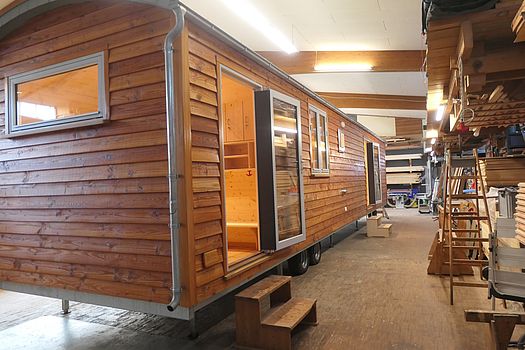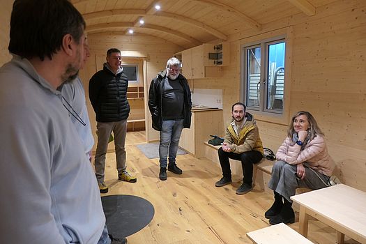 Inhaber Milan Podnar berichtete von der aktuell schwierigen Marktlage. Gern würde seine kleine Firma auch Tiny Houses bauen, aber hier werden viele Interessenten noch durch die bürokratischen Hemmnisse und eine enge Auslegung der Bauordnungen abgeschreckt. Alle Holzarbeiten werden in der Werkhalle erledigt, bei den Fahrgestellarbeiten und Flaschnerarbeiten werde auf regionale und bewährte Firmen zurückgegriffen.