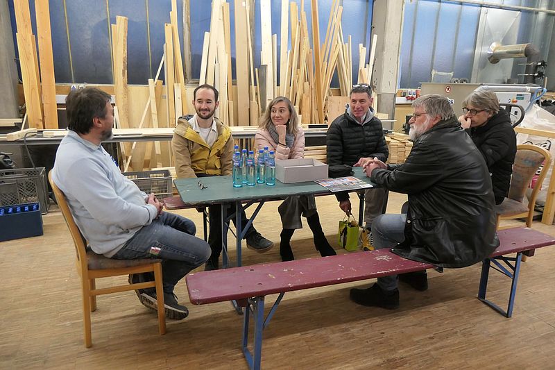 Der Landtagskandidat der Grünen Jens Metzger, selbst Schreiner und Besitzer eines Tiny-House, besuchte mit einer Gruppe der Grünen in Aixheim die Firma Müller, die aktuell vor allem Waldkindergartenwagen und Schäferwagen baut.
